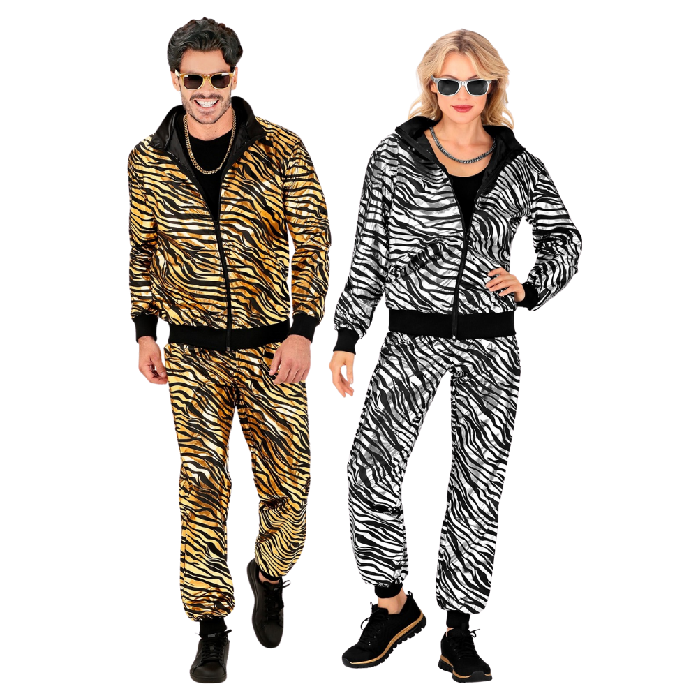 ¿Estás buscando chándals de táctel para ir en pareja? Con los disfraces de chándal para hombre y mujer con estampado animal print de tigre dorado y cebra plateada tendréis los chándals deportivos más estilosos para disfrazaros en la fiesta de disfraces.