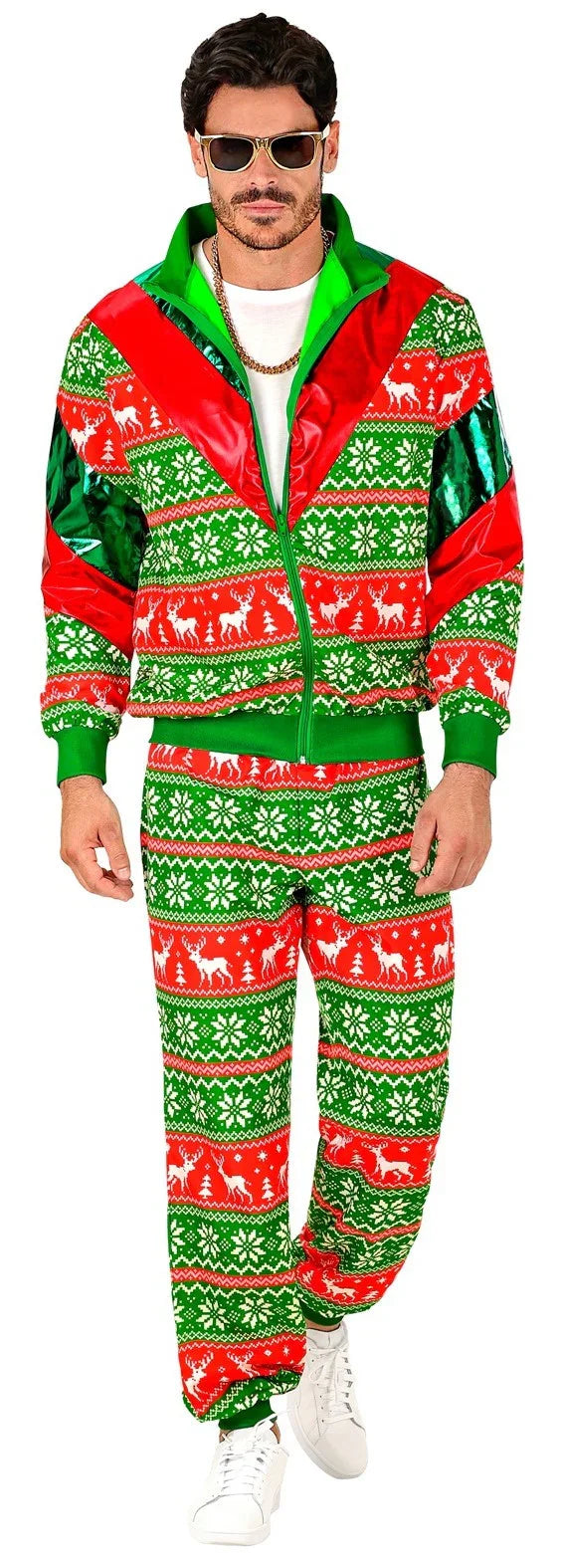 ¿Estás buscando un chándal con estampado navideño para tu fiesta? Con el chándal navideño verde y rojo para hombre o mujer tendrás el disfraz más a la moda con un estampado de copos de nieve y renos perfecto para tu fiesta de Navidad. Además, este chándal brillará bajo las luces UV (luz negra) por lo que destacarás en tu fiesta.