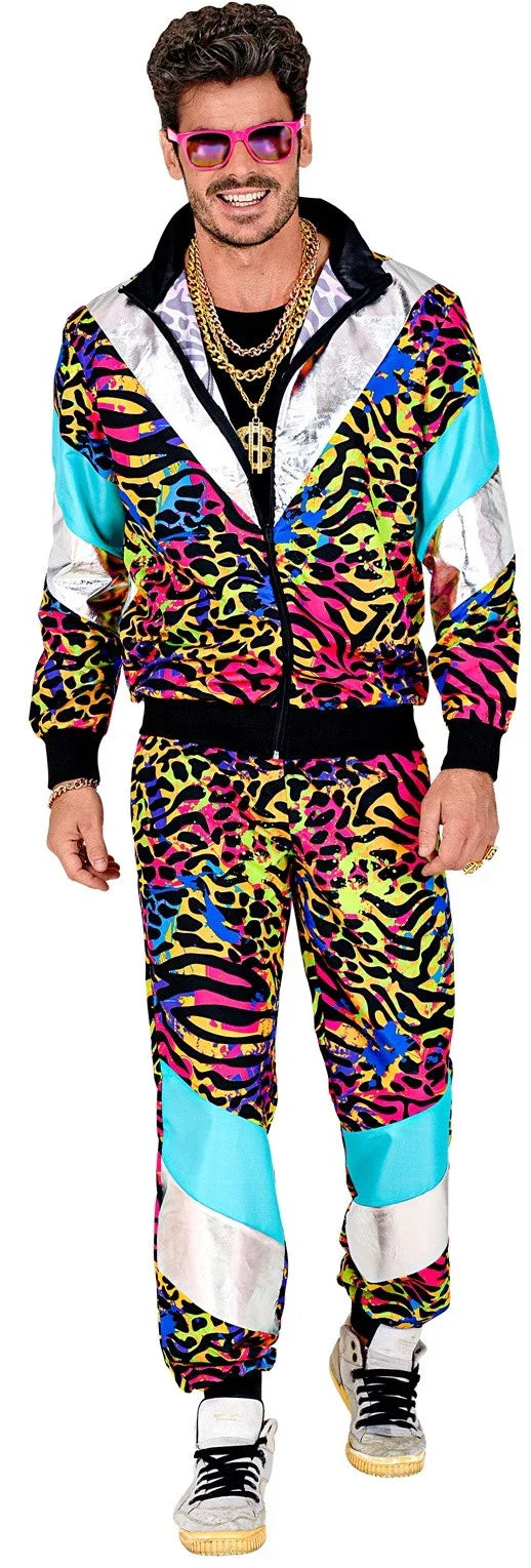 ¿Buscas el chándal ochentero más original para tu fiesta de disfraces? Este modelo de tejido de táctel con estampado de tigre de colores neón hará que te conviertas en el foco de atención de tu fiesta de los años 80.