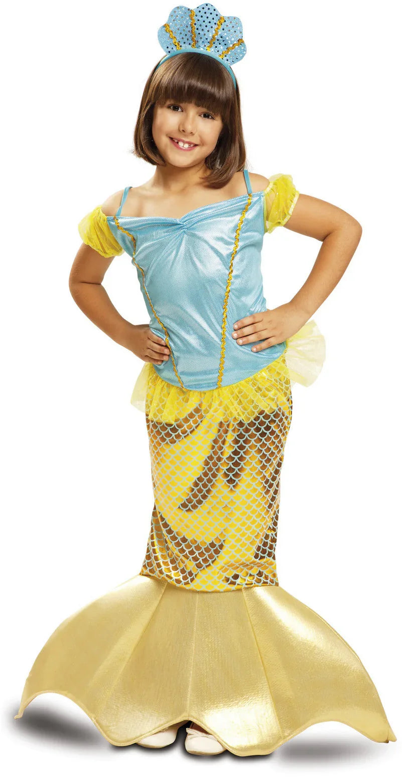 ¿Buscas el disfraz de sirenita más original? Este vestido infantil de sirena azul con cola de pez amarilla convertirá a la más pequeña de la casa en la sirena más original.