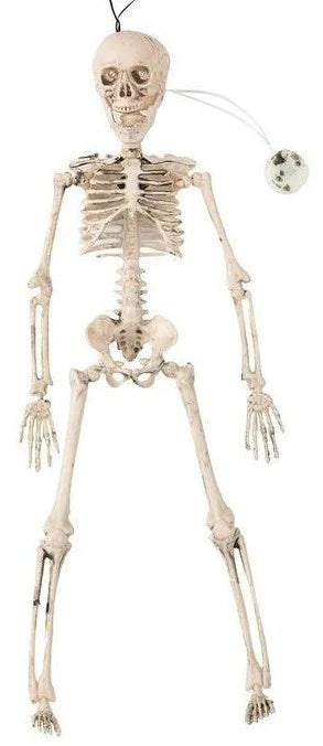 Incluye: esqueleto de 40cm con luz en los ojos y cordel para colgar. Pilas no incluidas.