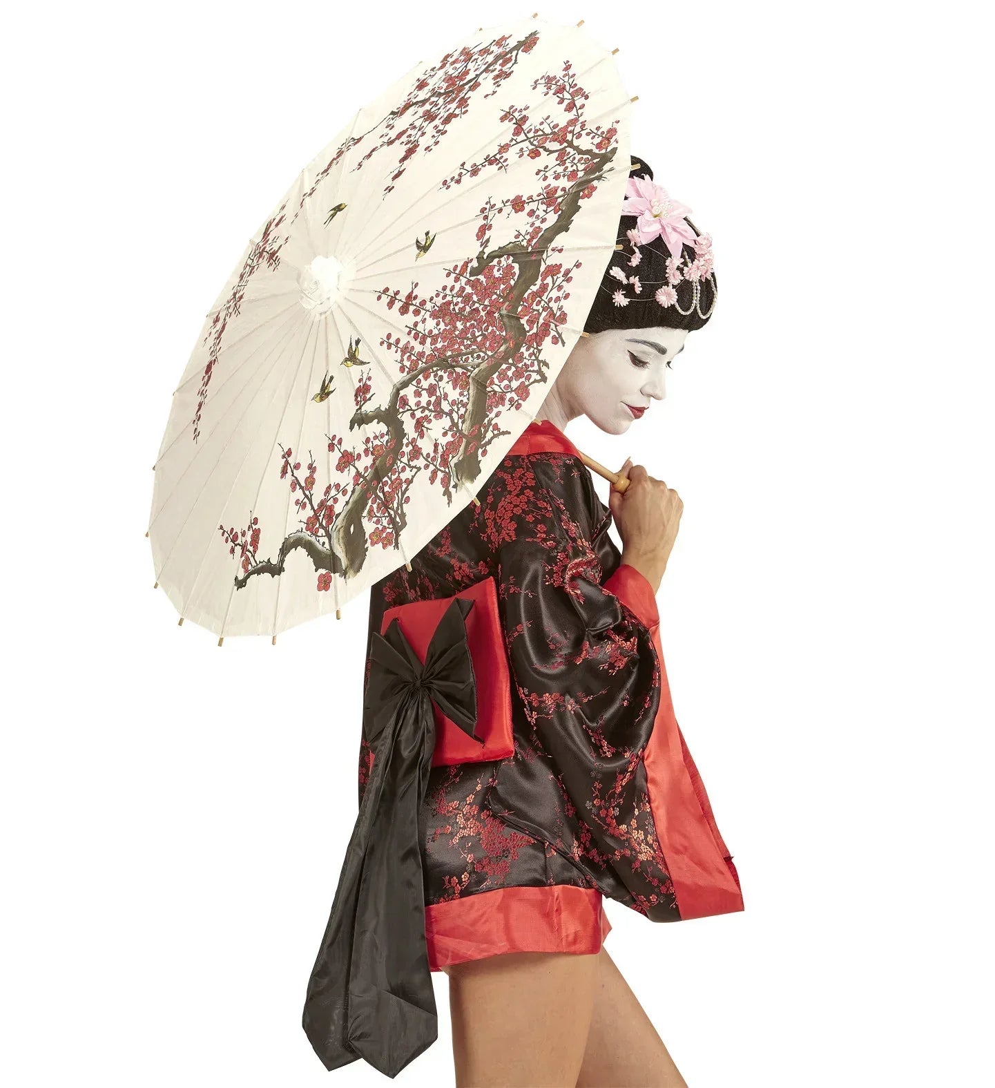 Parasol oriental de color blanco, de papel de arroz decorado con motivos orientales, con estructura de madera, el complemento imprescindible para tus disfraces de geisha, china y japonesa. Diámetro 84 cm.