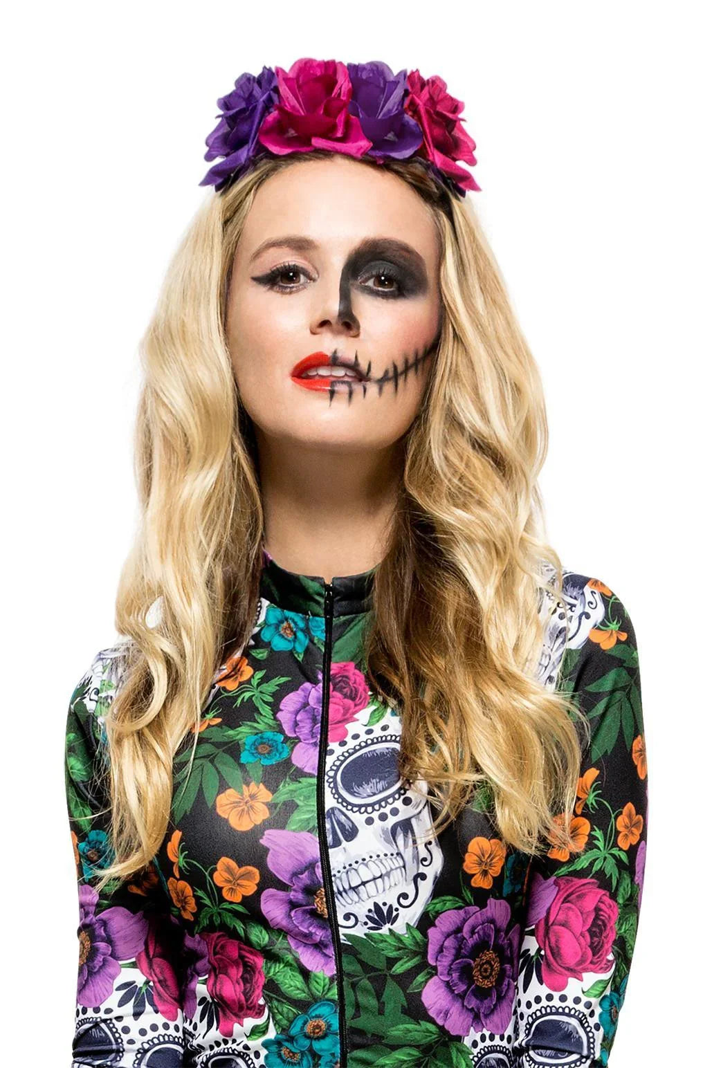 Estás à procura de uma tiara para o teu disfarce de catrina? Com a tiara de catrina com flores rosas e roxas terás o complemento perfeito para o teu disfarce de morte mexicana, e vais arrasar na tua festa de Halloween.