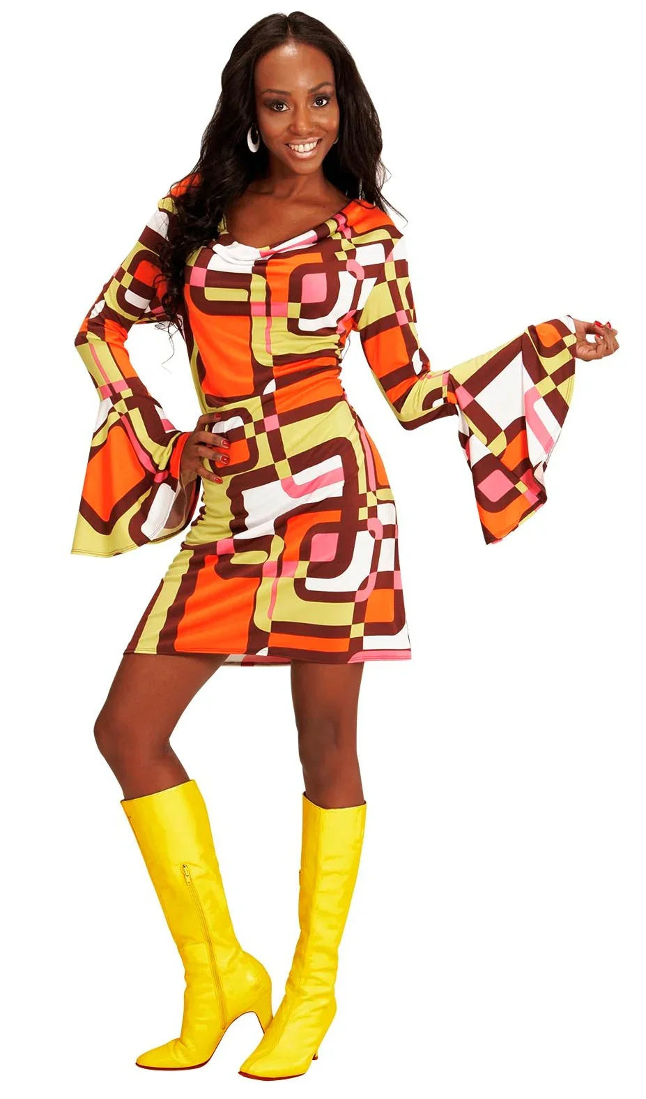 Estás à procura de um vestido disco para a tua festa dos anos 70? Com o fato disco anos 70 para adulto com quadrados laranja, amarelos, rosas e brancos, terás o vestido ideal para a tua festa ambientada nesta década inesquecível.