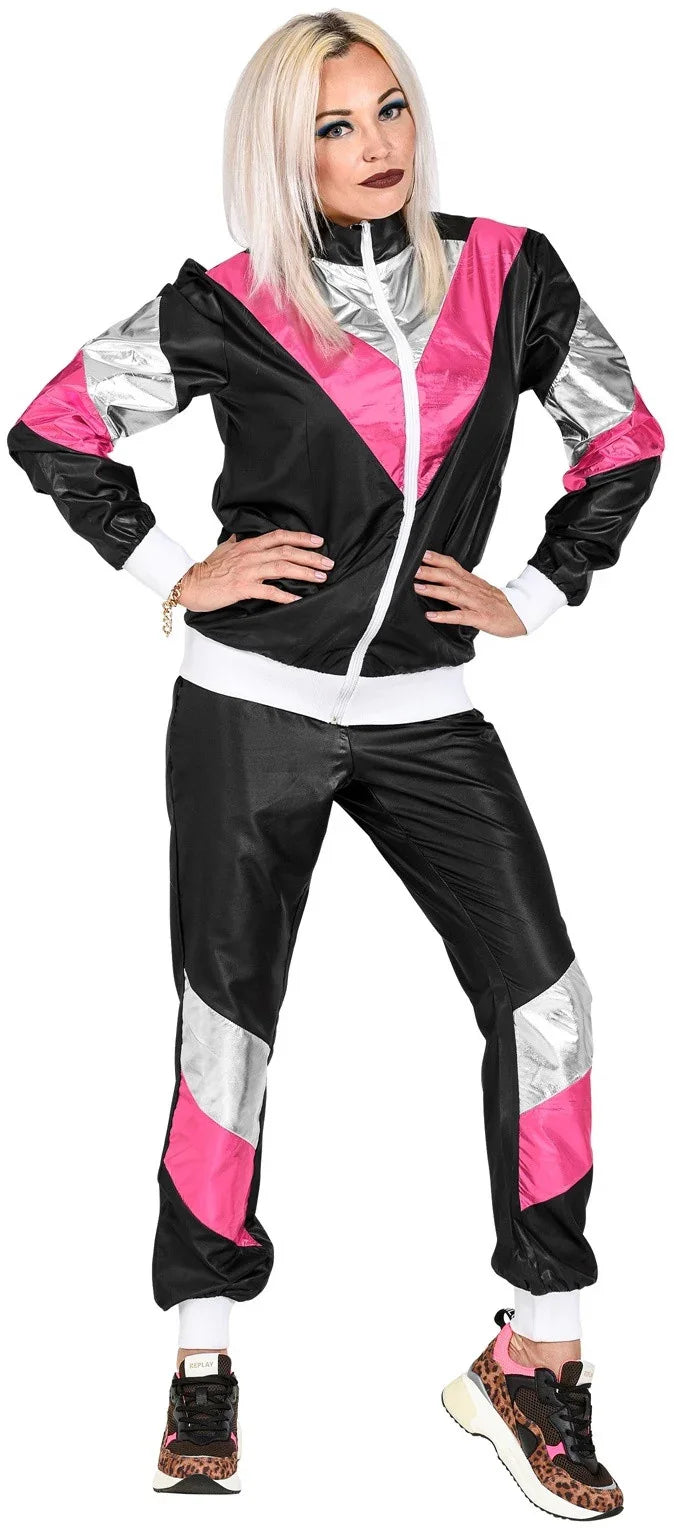 Queres vestir-te com o estilo mais puro dos anos 80? Com o fato de tactel preto brilhante para homem ou mulher com detalhes rosas, terás a roupa perfeita para te vestires como um verdadeiro rapaz dos anos 80, e vais destacar-te na tua festa de disfarces pelo seu grande realismo e qualidade.