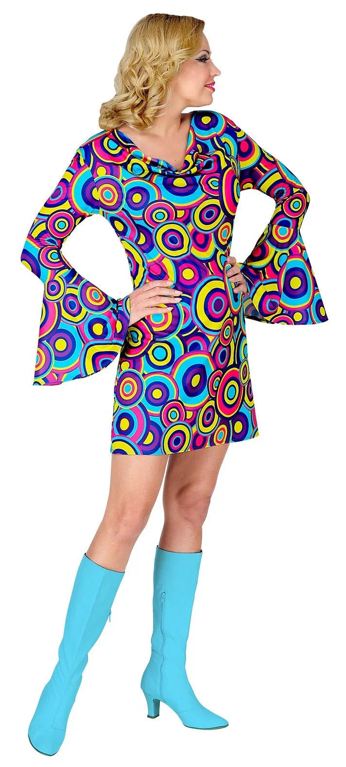 Estás à procura de um vestido disco para a tua festa dos anos 70? Com o fato disco setentista para adulto com círculos psicodélicos de cores terás o vestido perfeito para te disfarçar ao mais puro estilo dos anos 70, e vais arrasar na tua festa de disfarces.