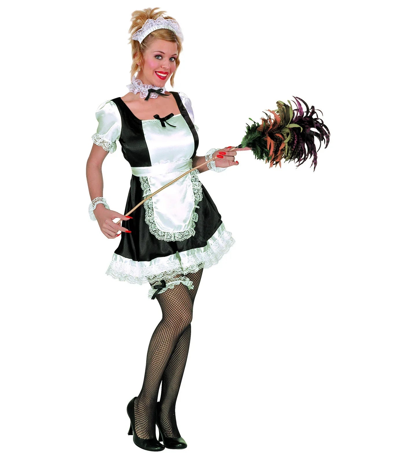 O fato de criada francesa para mulher inclui: Vestido, avental, adereço de cabeça, colar, punhos e liga.