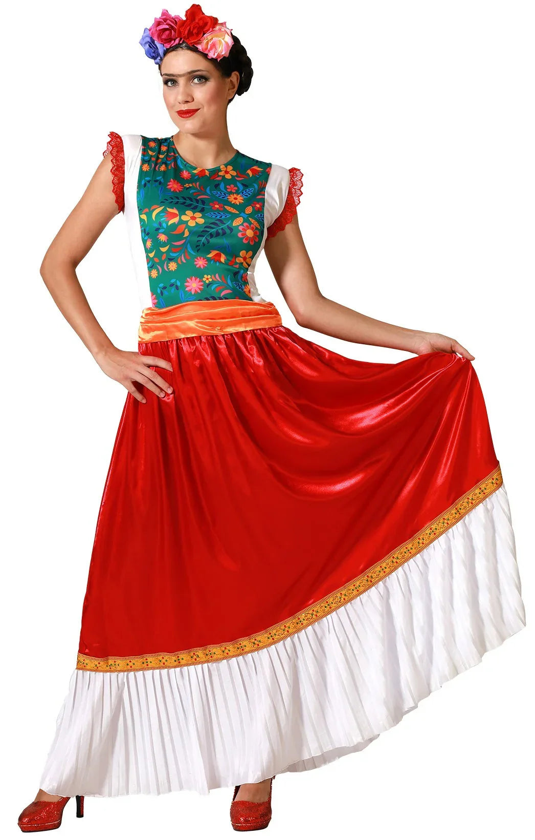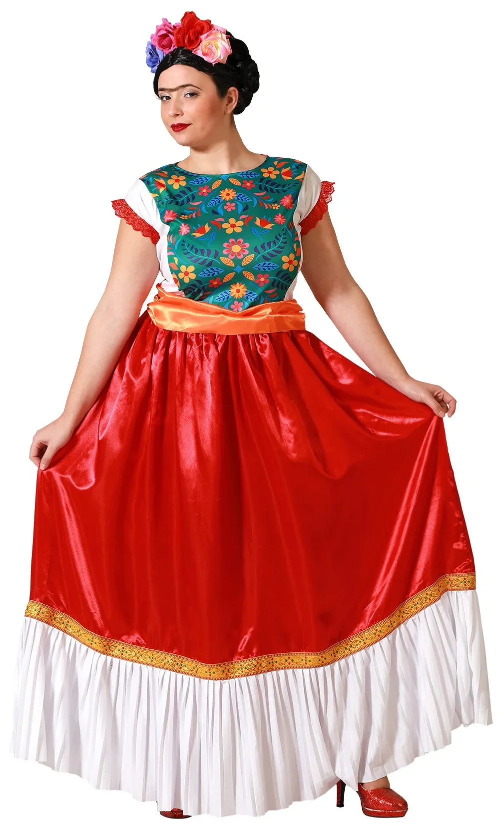 Queres vestir-te como a famosa pintora Frida Kahlo? Com o fato de Frida Kahlo para adulto com vestido floral terás a roupa perfeita para te disfarçar como esta famosa artista mexicana e vais arrasar na tua festa de disfarces.