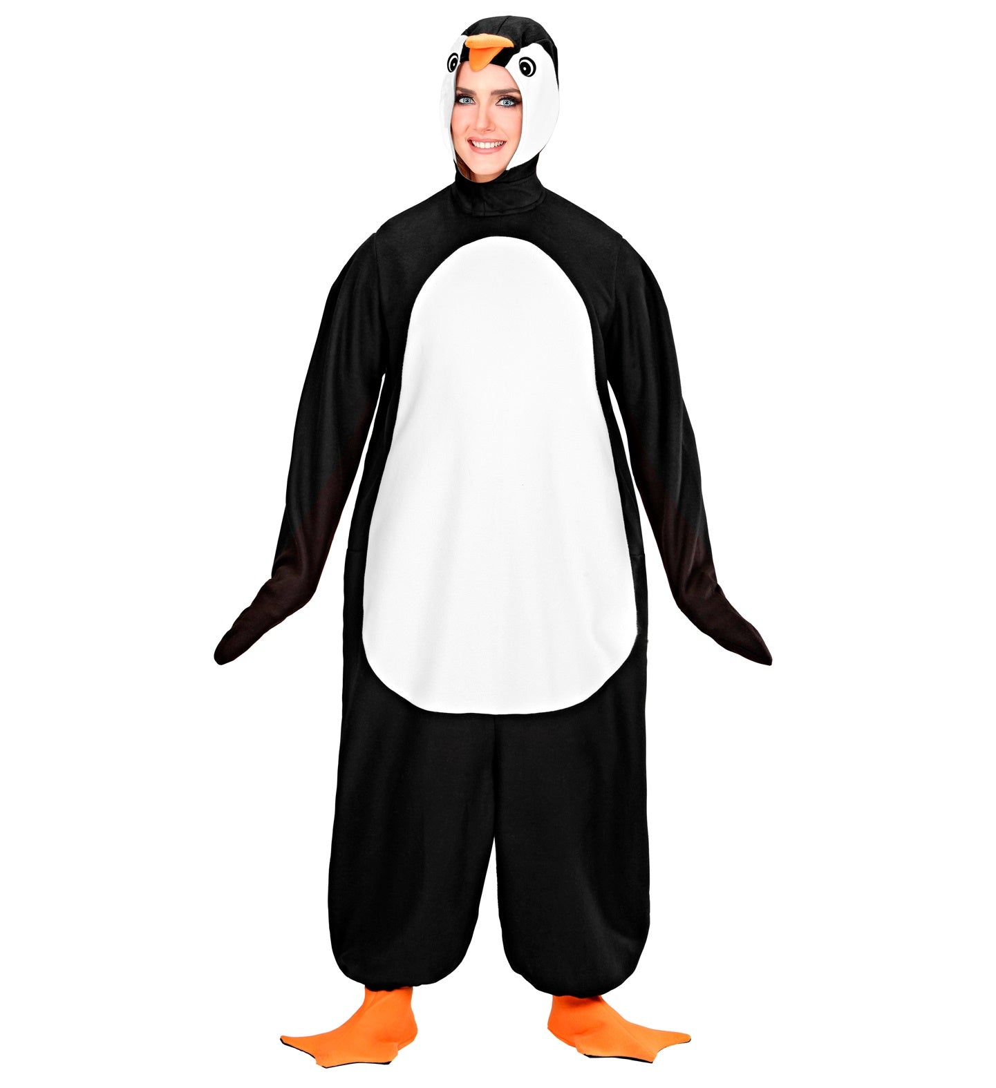 Este original fato de pinguim inclui macacão, gorro com máscara e sapatos.