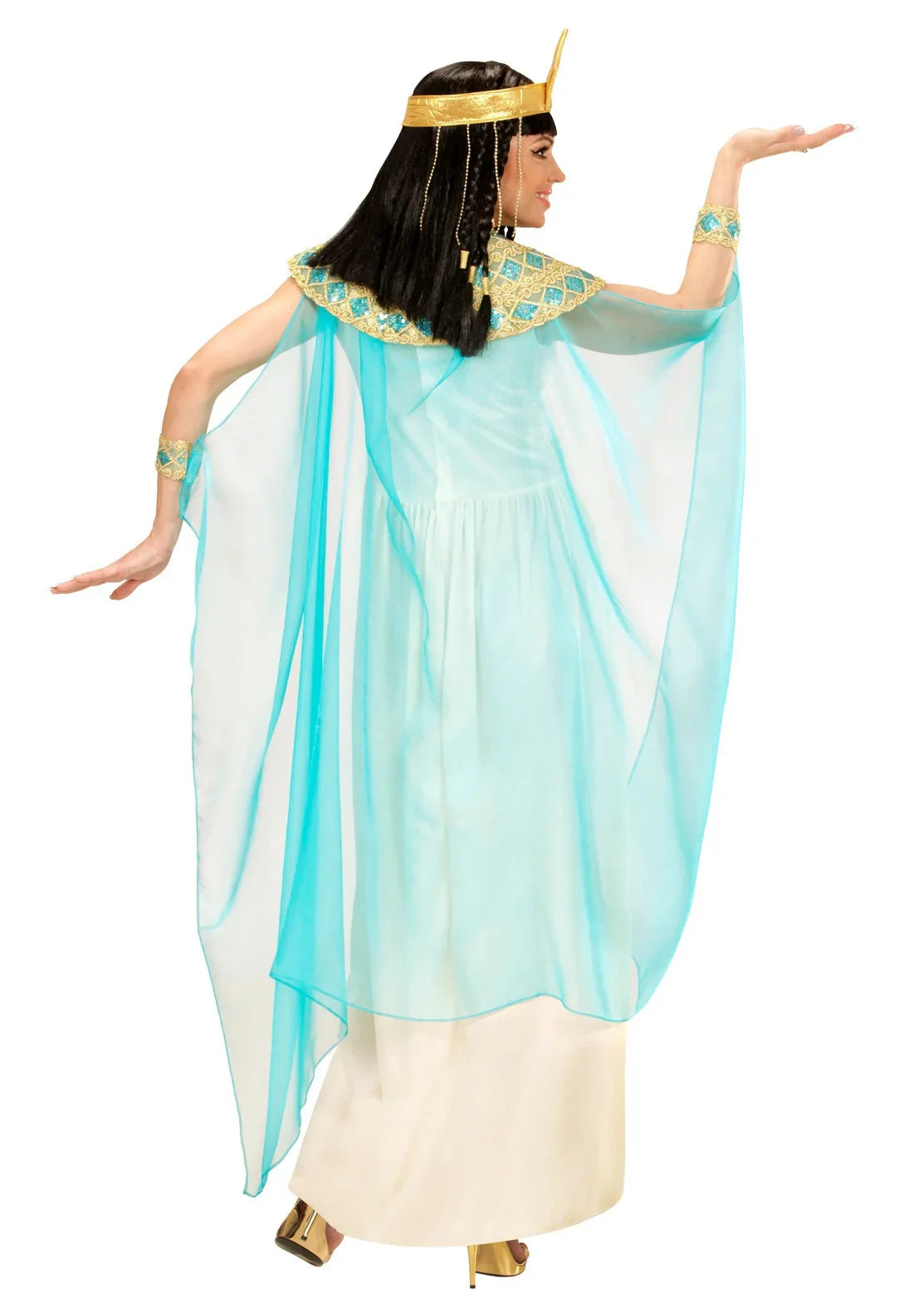 Este fato de rainha Cleópatra é composto por um vestido branco; cinto, colar e pulseiras dourados com lantejoulas azuis; uma cobertura de cabeça dourada; e uma capa de tule azul.