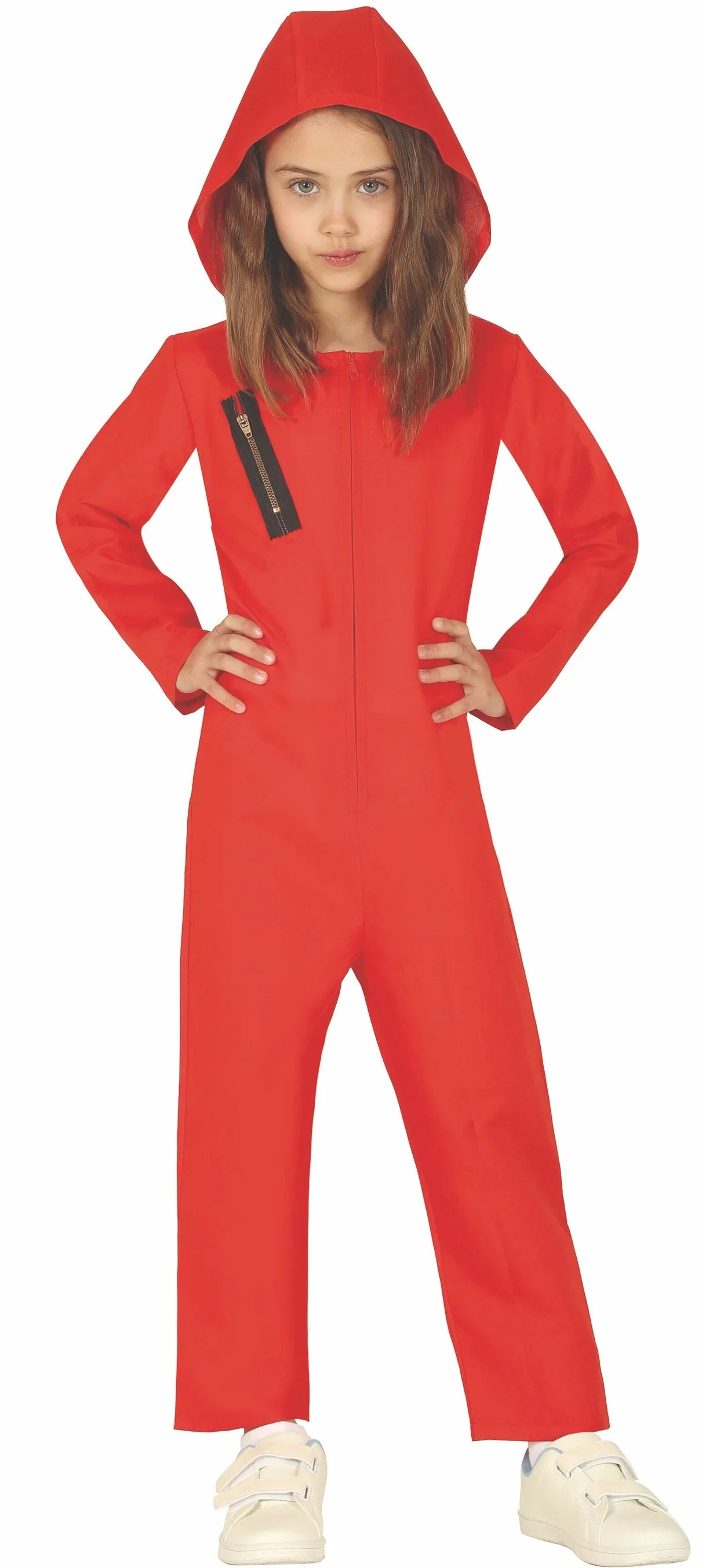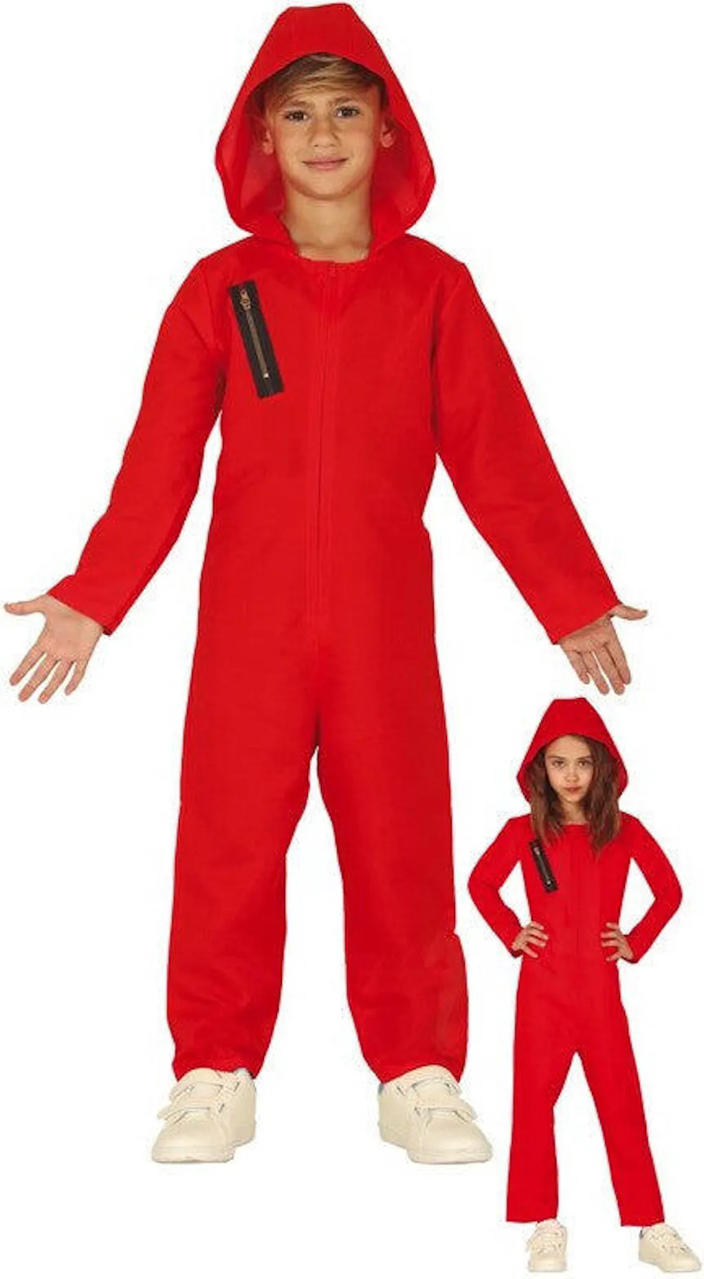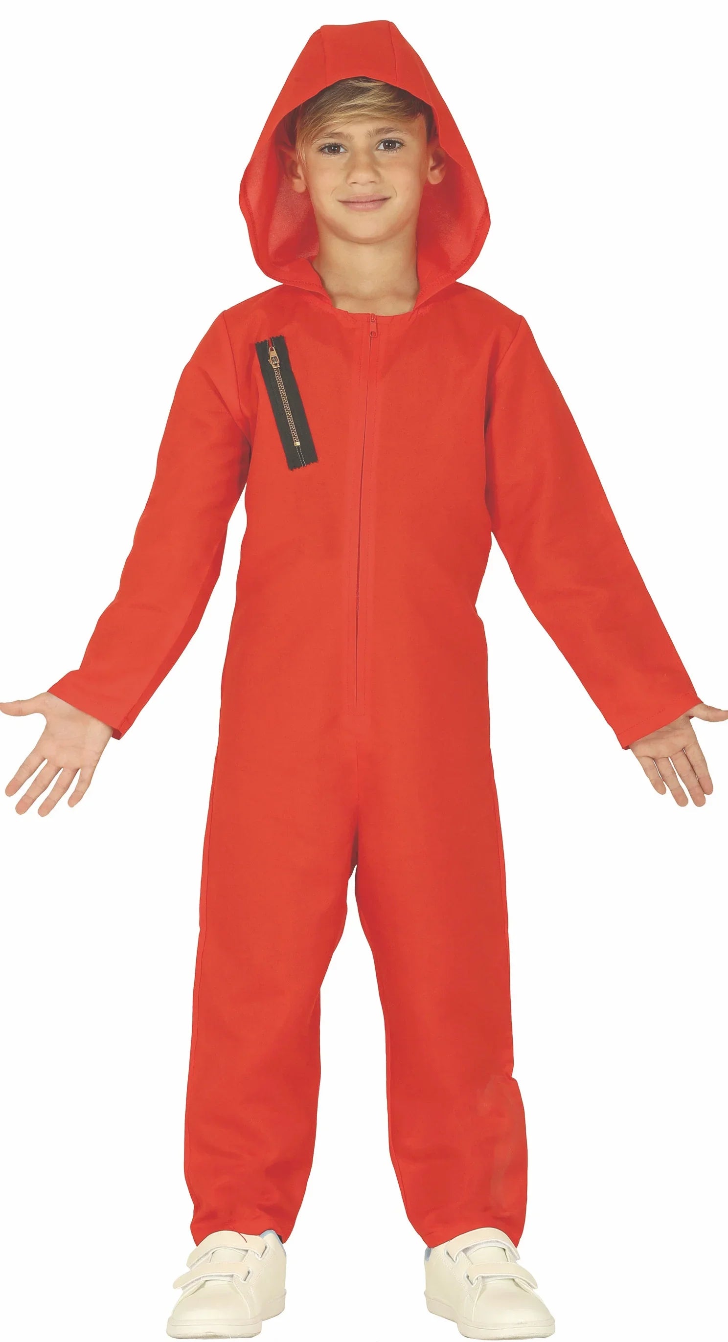 Inclui: Macacão vermelho com capuz e fecho éclair.