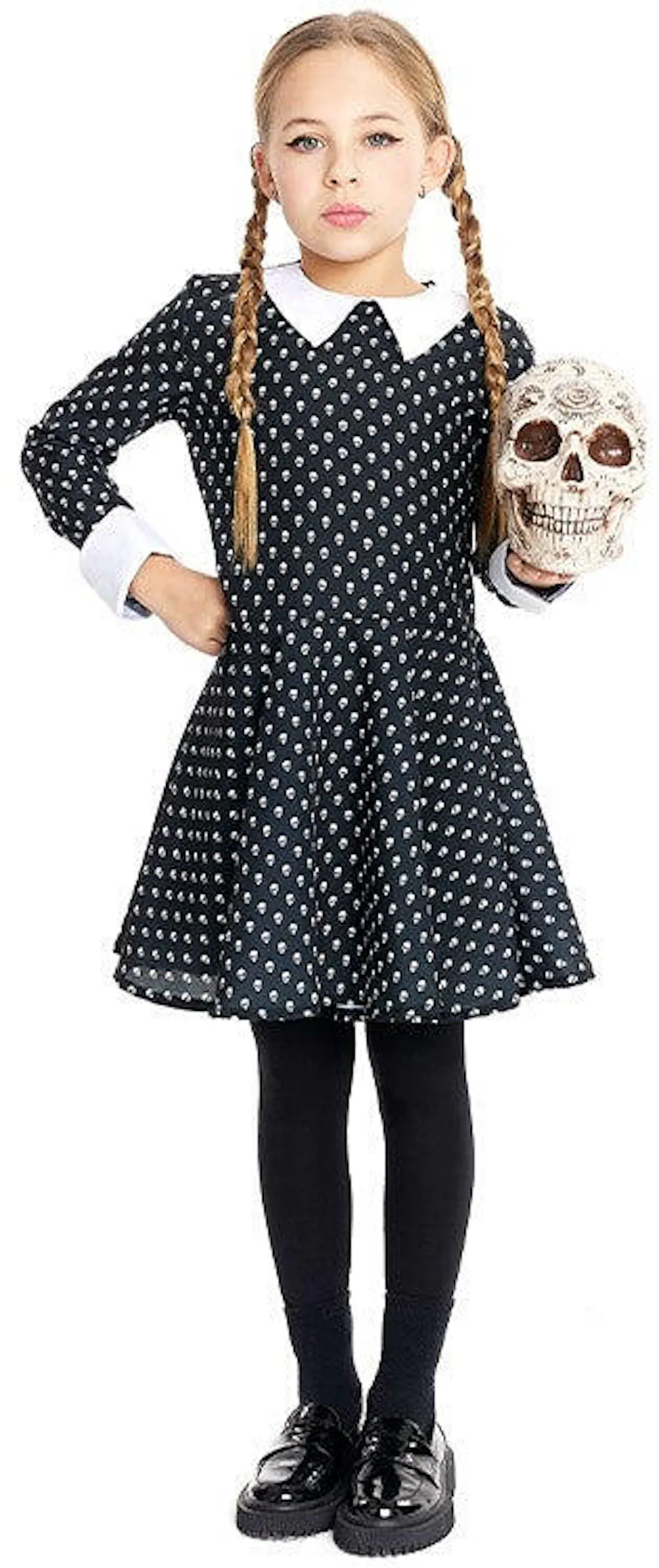 Disfraz de Miércoles con Lunares Calaveras para Niña Miércoles Addams Partilandia