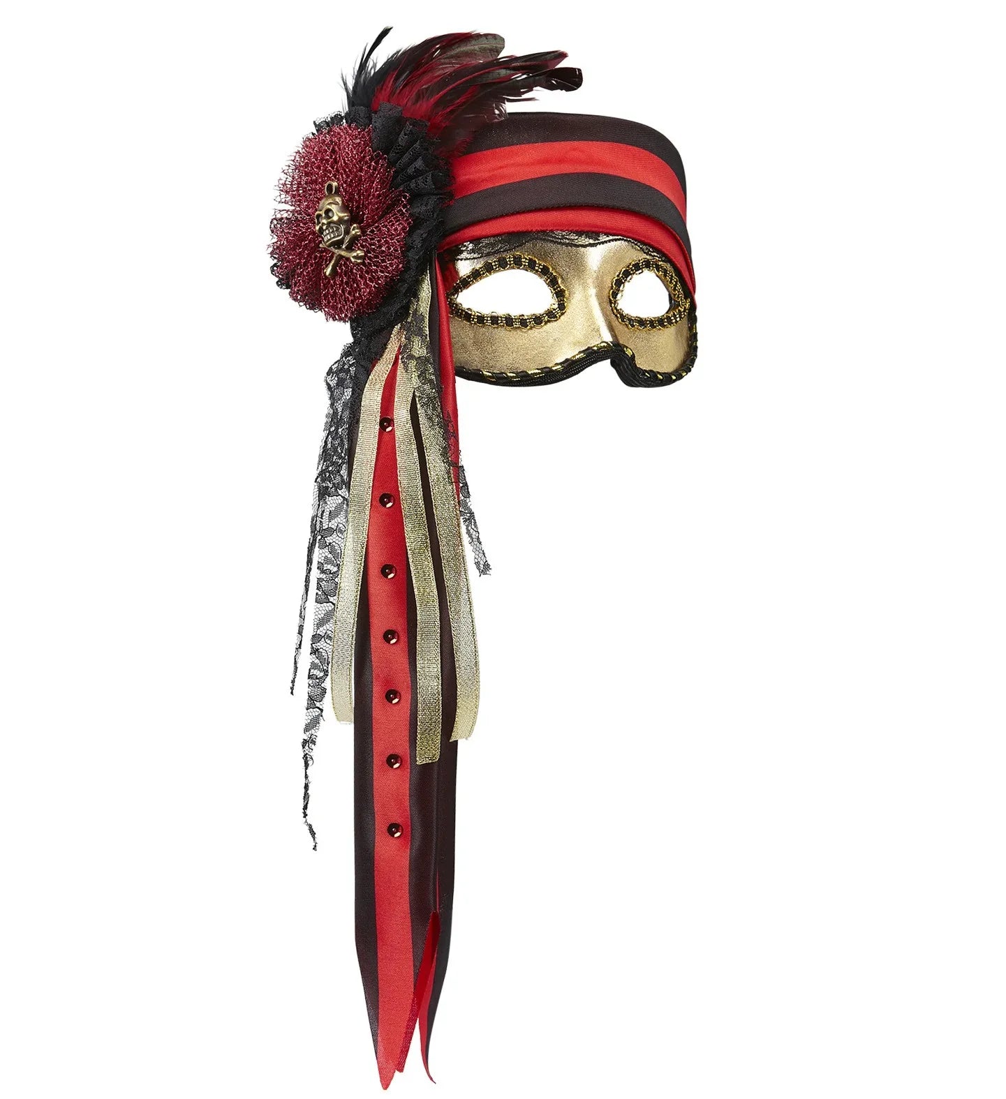 Máscara de Pirata muito inovadora e original. Decorada com tecido, passamanarias e renda. Esta máscara de pirata possui um fecho lateral com tule de lame, renda, penas e esqueleto. Uma máscara de pirata que temos a certeza que vai adorar, com a qual vai transformar qualquer fato de pirata que usar.