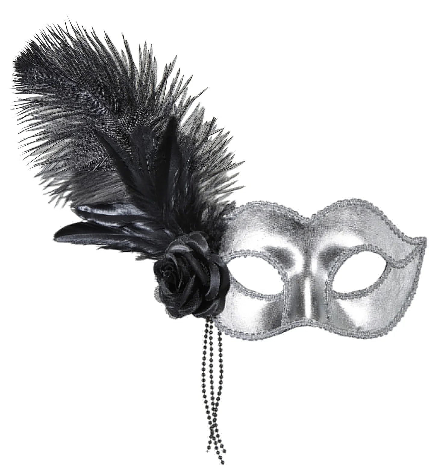 Máscara prateada com flor e penas