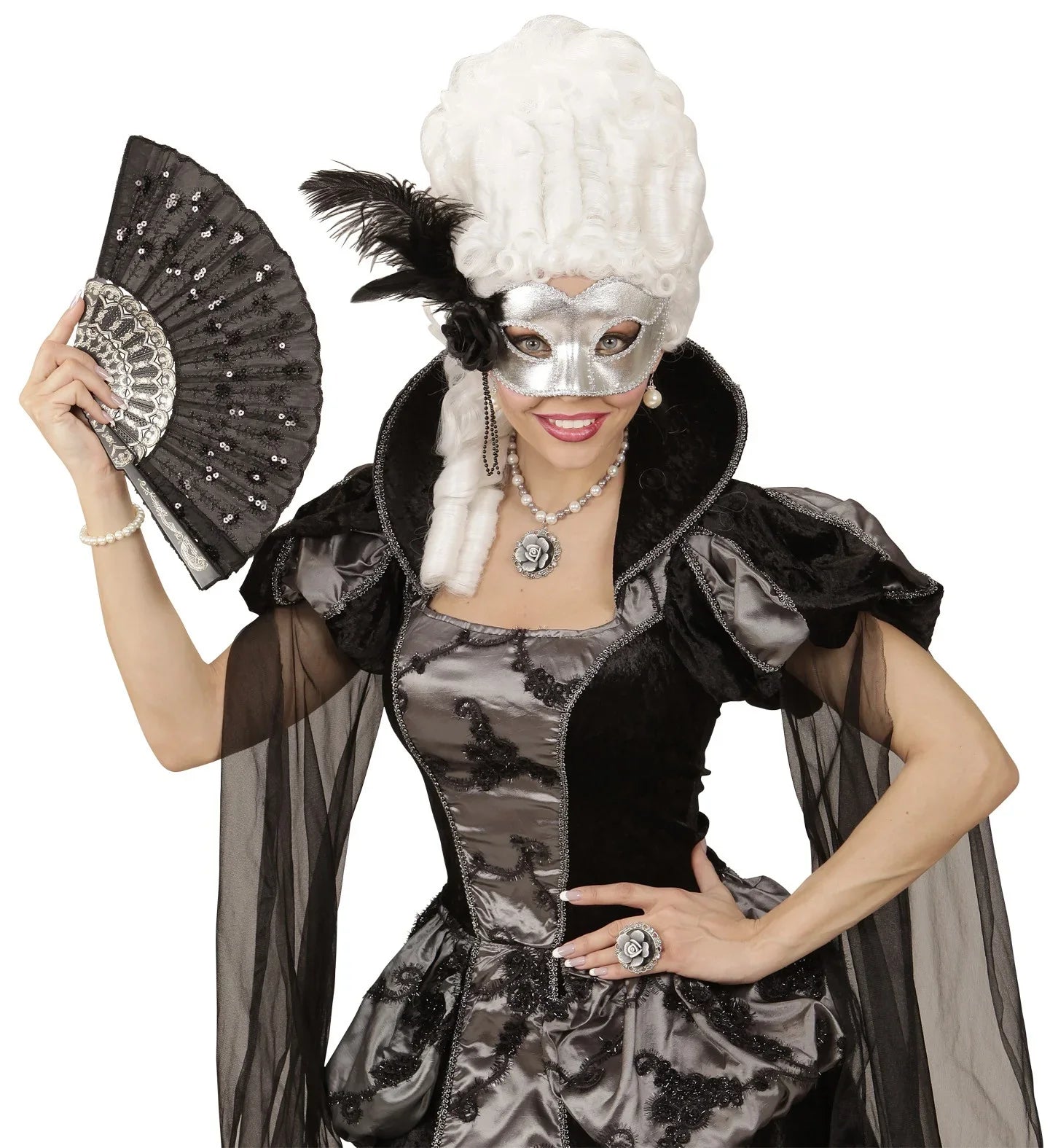 Antifaz prateado de qualidade, decorado com passamanaria prata, flor e penas. Este antifaz é uma compra segura, pois poderá usá-lo com a maioria dos seus fatos.