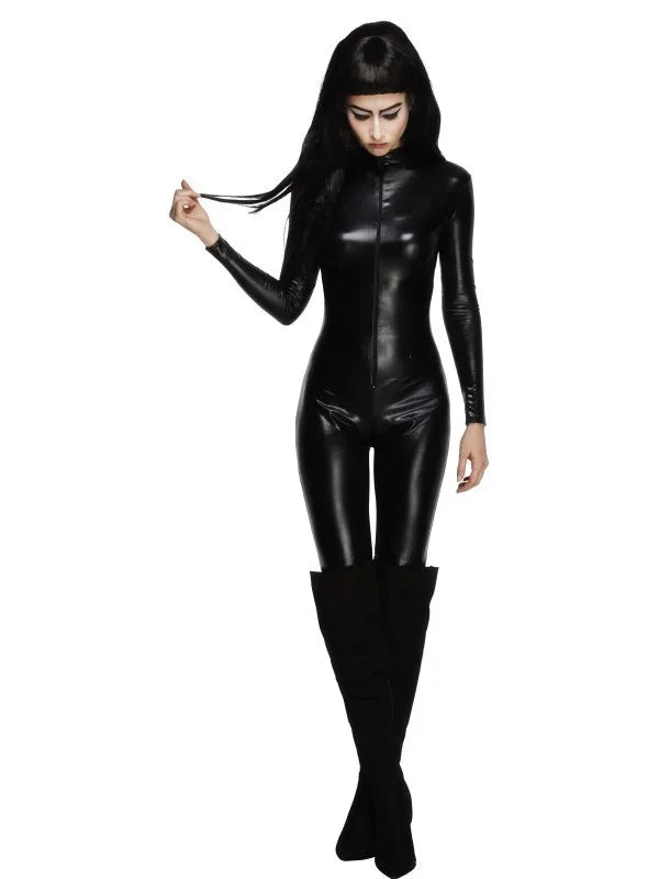 Este fato é composto por uma malha ajustada de lycra de alta qualidade, com muito brilho, tipo verniz. De corpo inteiro com fecho éclair central. Este fato tem possibilidades infinitas, uma das que mais gostam é para usar como Catwoman, uma das super-heroínas mais apreciadas. Na nossa loja de fatos, tem todo o tipo de acessórios para que possa personalizá-lo ao seu gosto.