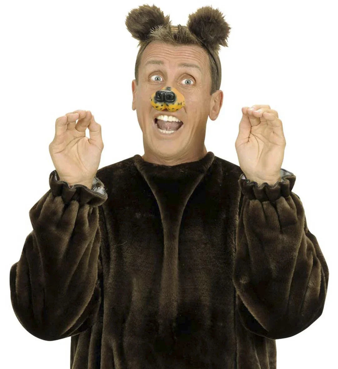 O complemento inclui uma tiara com orelhas de urso feitas com pelúcia de pelo curto e longo na cor castanha.