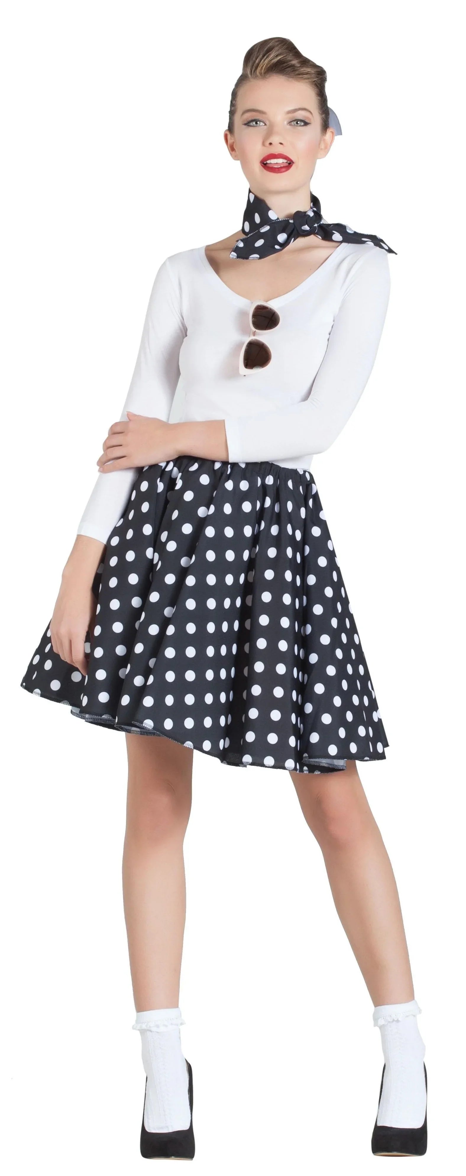 Está à procura de uma saia estilo anos 50 para o seu fato? Com a saia preta anos 50 com bolinhas e lenço para adulto terá o acessório perfeito para se vestir com a moda da maravilhosa década de 50, e vai arrasar na sua festa de disfarces.